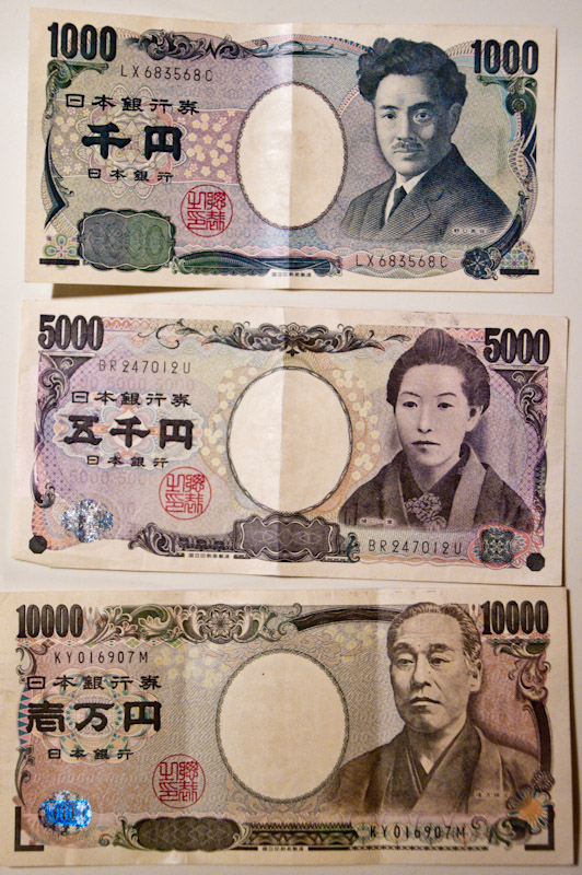 A presque une semaine du départ, me voici riche de plus de 45 000 yens (360 € environ). Ci-dessous un aperçu des billets.